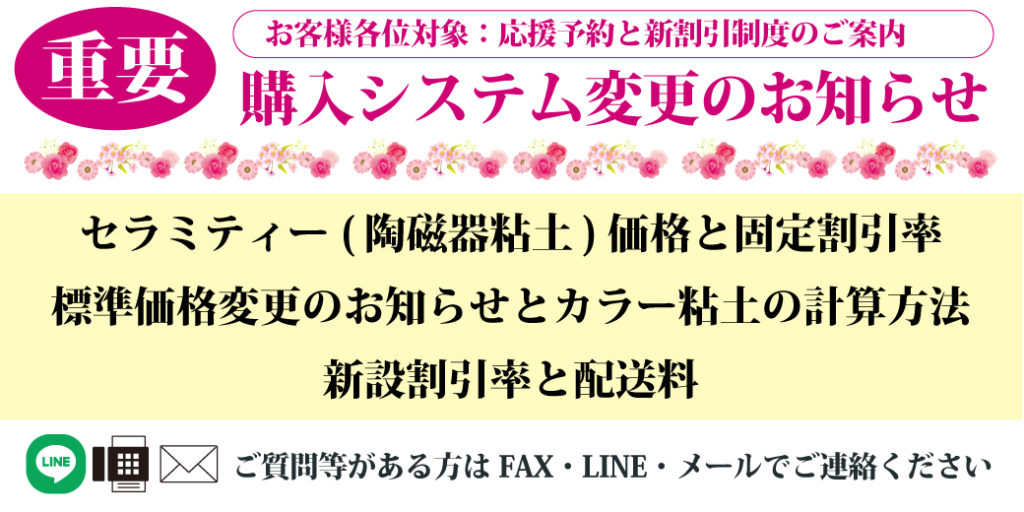 セラミティー粘土(陶磁器粘土)価格と固定割引率について 1.セラミティー応援予約でご購入いただいた方 セラミティー粘土は、原材料費・輸送コストの高騰により、今回の販売から、標準価格を1,200円(税込)に改定し販売致しました。「予約販売のみ」の1,00... -