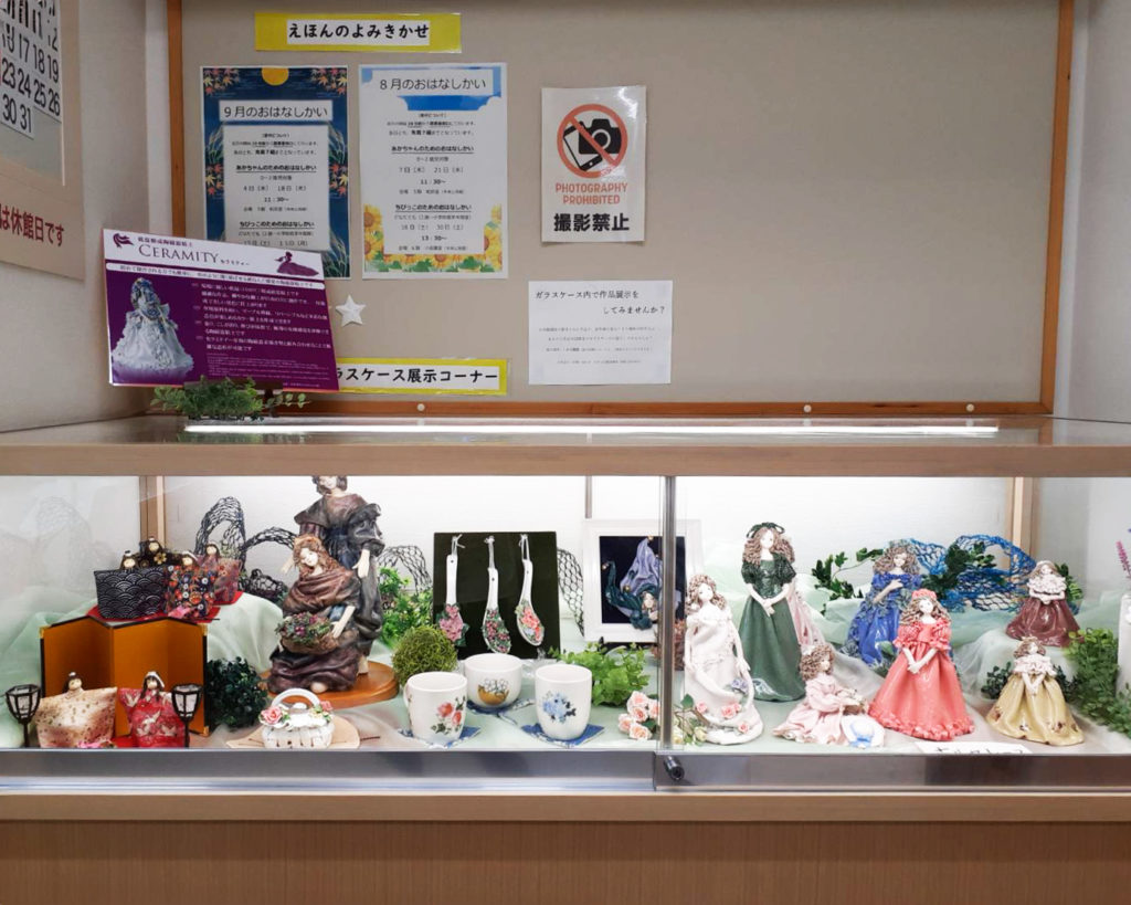 ショーケース内には、セラミティーを使用した美しいドール作品や、スタンドレッグを用いた立ち人形も展示されており、どれも高度な焼成技術と繊細な表現力が感じられます。特に、ひび割れなく仕上げられたセラミティーの作品や、難易度の高い立ちポーズの安定感ある造形は創作技術の高さを表現しています。