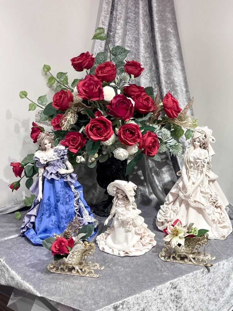 赤いバラに囲まれた幻想的なディスプレイの中、