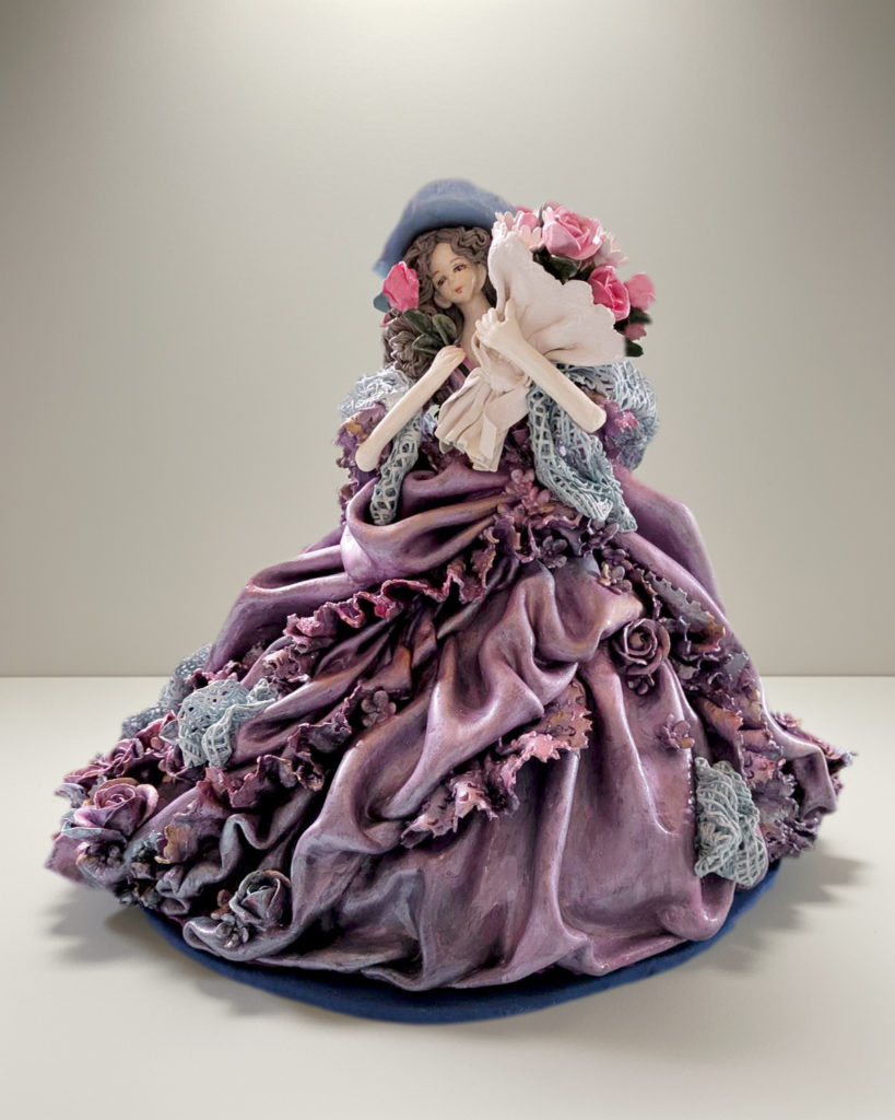 繊細に折り重ねられたスカートの流れや、花束を抱く指先まで、すべて陶磁器粘土で丁寧に表現されています。
