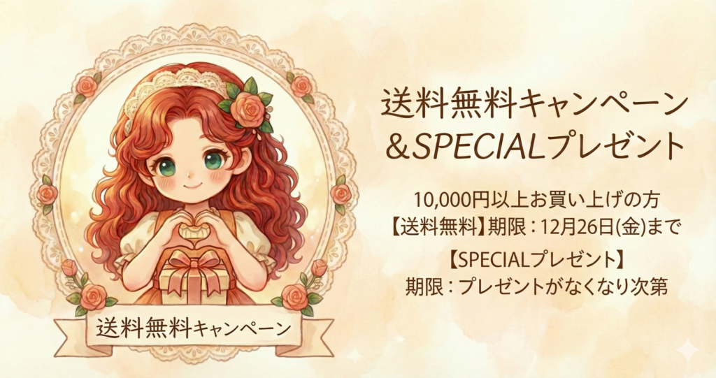 送料無料キャンペーン & SPECIALプレゼント ただいま【年末キャンペーン】として、この冬だけの特別企画をご用意しました! 10,000円以上のお買い物で、なんと送料無料&豪華プレゼントがついてきます✨ ぜひこの機会をお見逃しなく! キャンペーン概... -